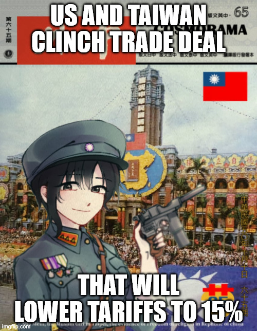 Various reports say the US and Taiwan have clinched a trade pact to cut tariffs to 15% in exchange for a $500 billion Taiwanese commitment. For the money, half of it will be direct investment in US manufacturing and half of it credit guarantees for other investments in the US.